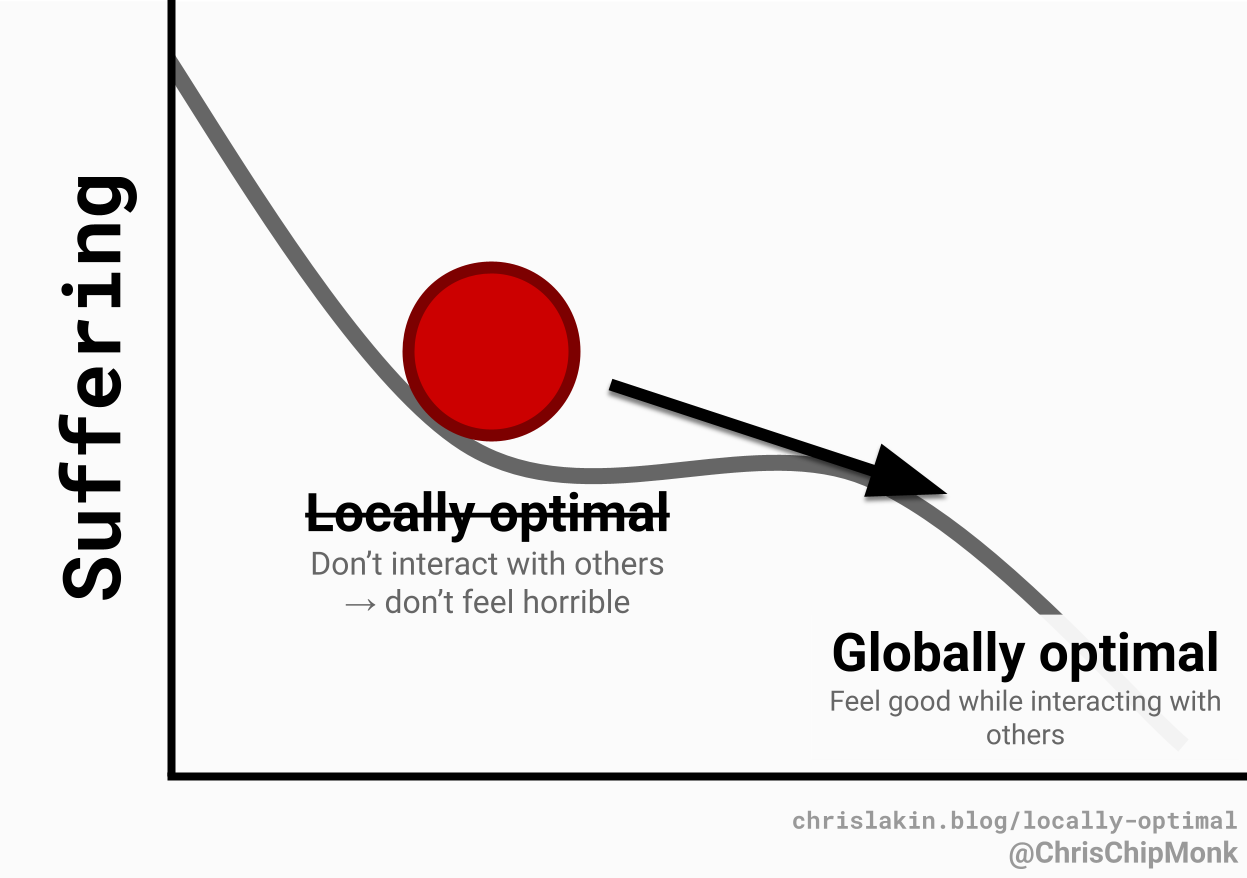 Soon I discovered it wasn’t just my depression and anxiety that were “locally optimal strategies”, but also my conflict avoidance, emotional numbness, eye contact, boundaries, neck pain…