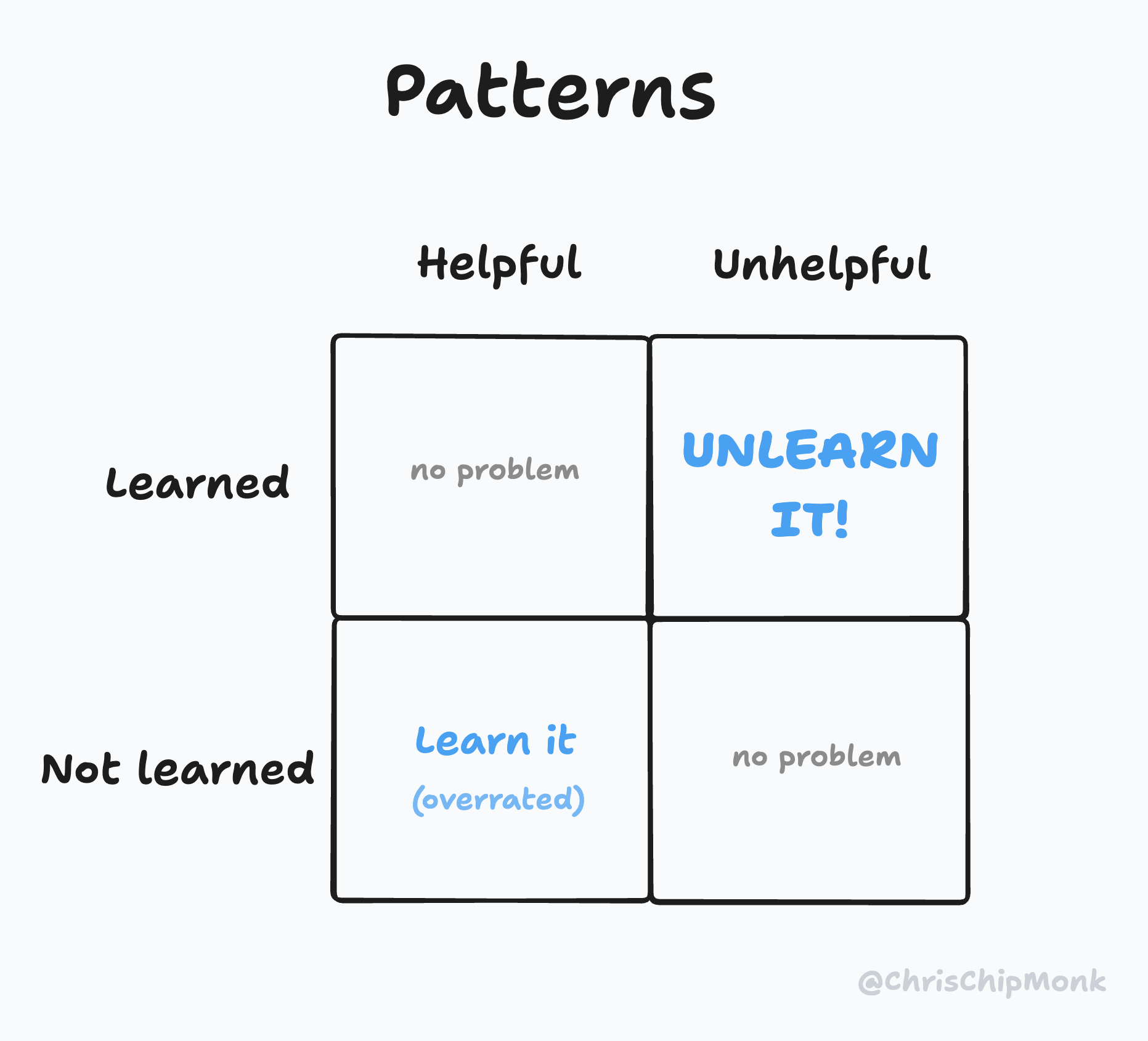 Similarly, most growth advice focuses on learning, not unlearning. You’ve probably heard advice like “learn to set boundaries”, “learn nonviolent communication”, “learn to be present”, “learn to say No”, “learn to handle conflicts well”, “learn to accept yourself”. Maybe you've even given this advice yourself.